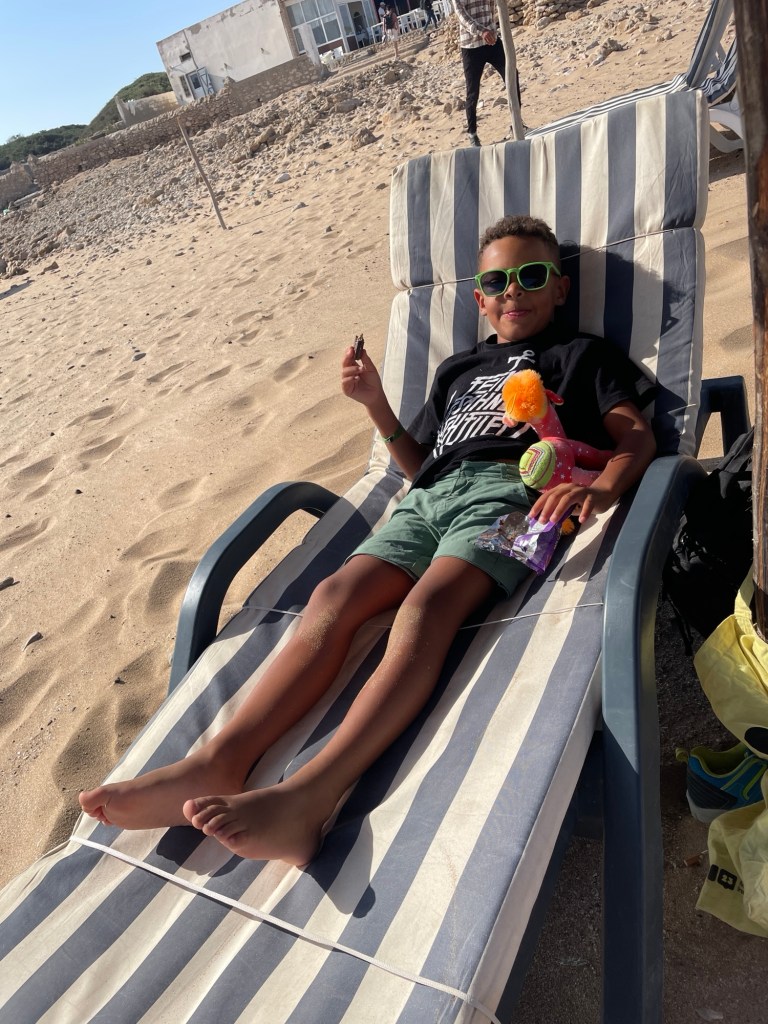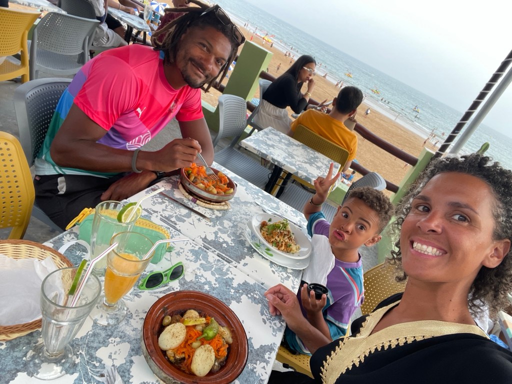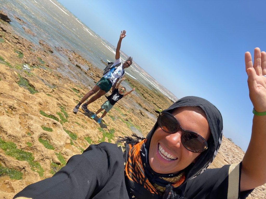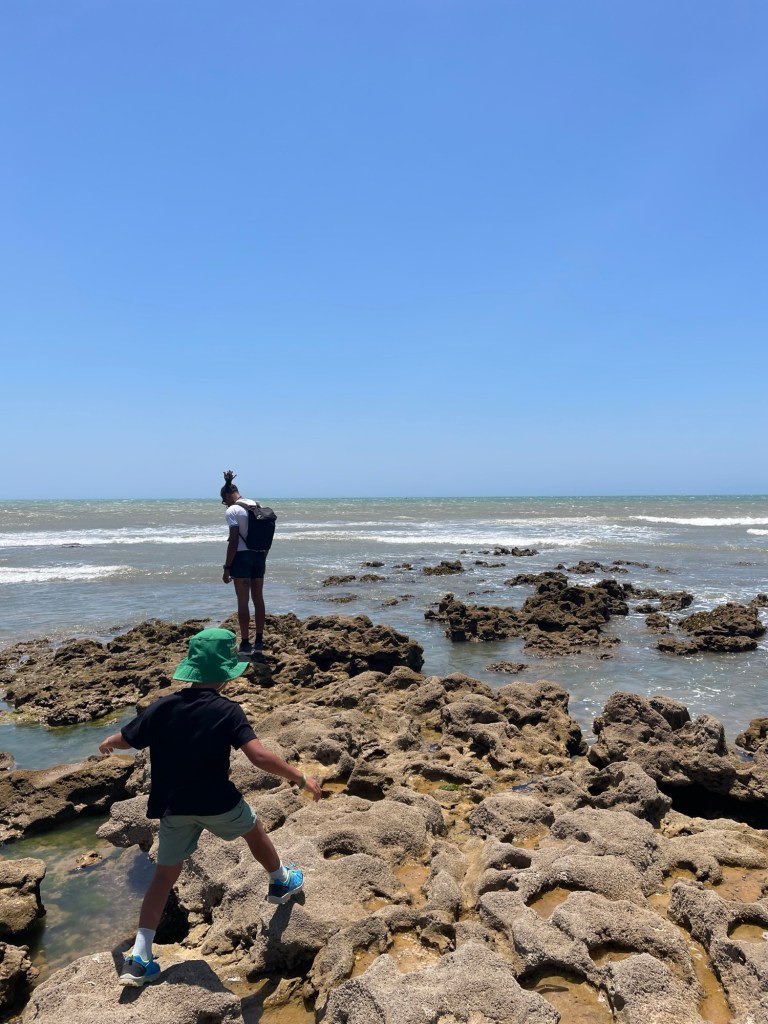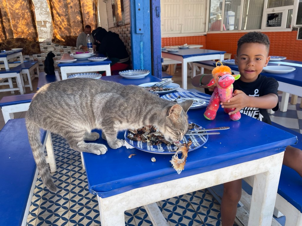 Unser Campingplatz lag etwas außerhalb der Stadt in Sidi Kaouki, und obwohl es an den wenigen Tagen, die wir dort verbrachten, extrem windig war, konnten wir ein paar Tage am breiten Sandstrand genießen. Hier hatten Sol und ich das lustige Erlebnis, auf einem launischen Kamel namens Baba Ganoush zu reiten, und wir gingen an der nahe gelegenen Felsenküste auf Krabbenjagd.