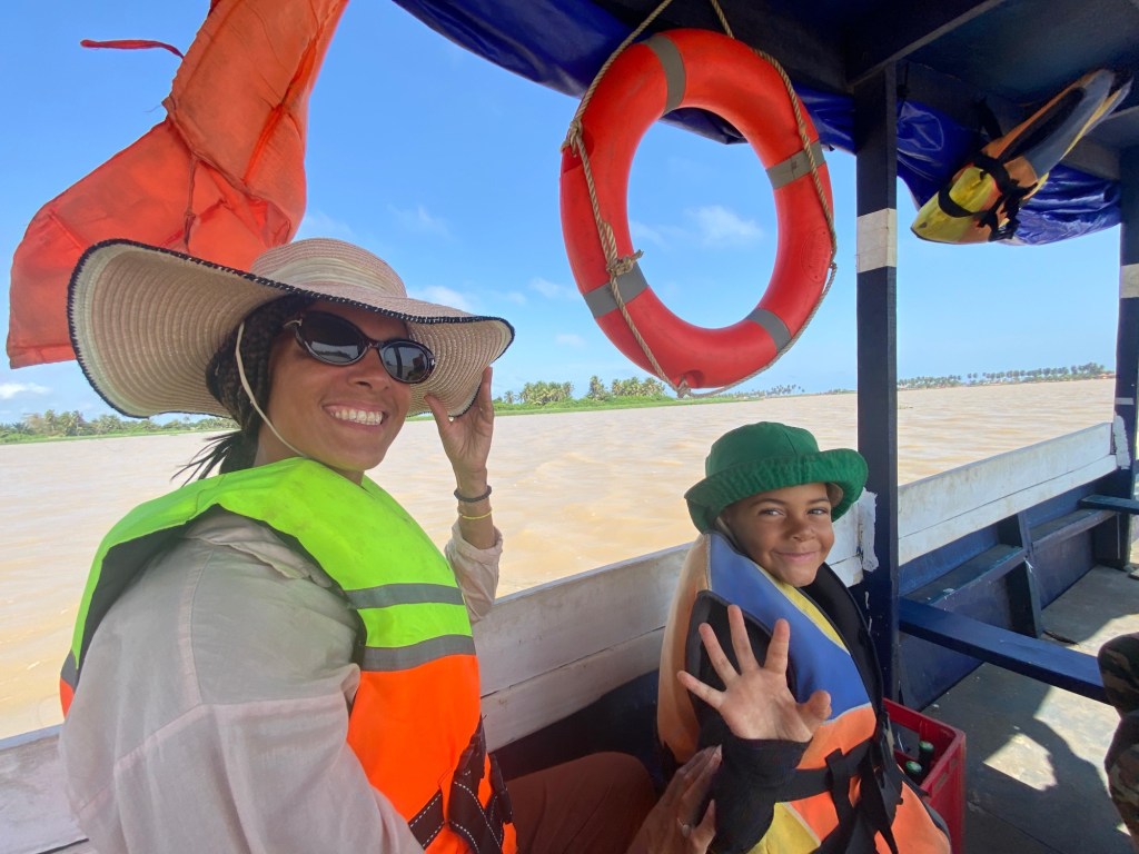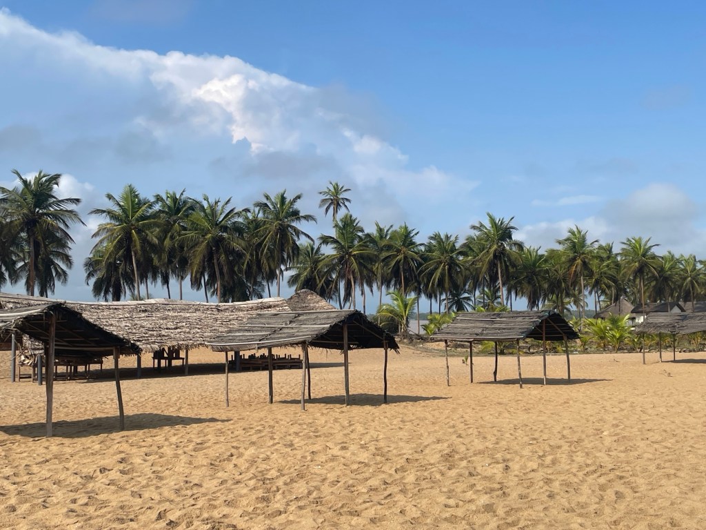 We heard some monkeys rustling about in the bush, but unfortunately didn’t spot any. We took a short refreshment break in a nearby eco-hotel and then headed back to camp and began packing up our tent. In the afternoon we drove a few kilometres to the other side of the Bandama River to Grand Lahou, where we took a small boat for a tour of the lagoon and where the river opens out to the sea. It was a stunning boat trip and the stroll on the peninsula was incredible to have the lagoon on one side and open sea on the other. We admired some of the beautiful houses that had been built in this lovely location.