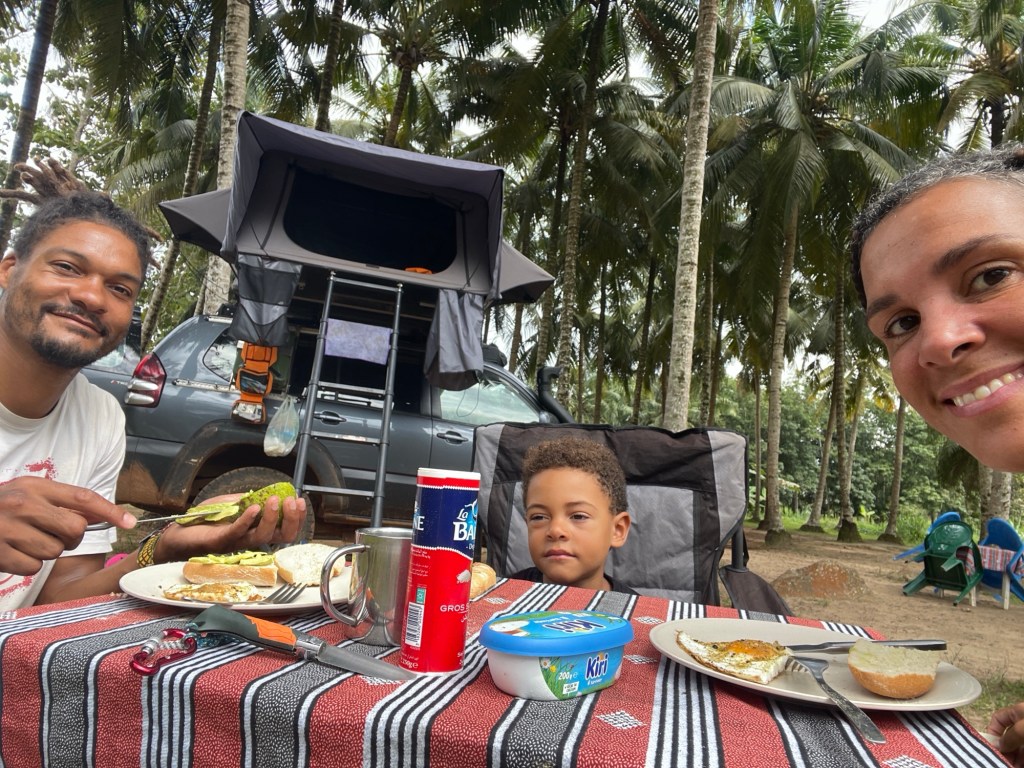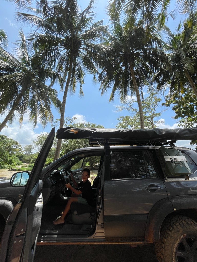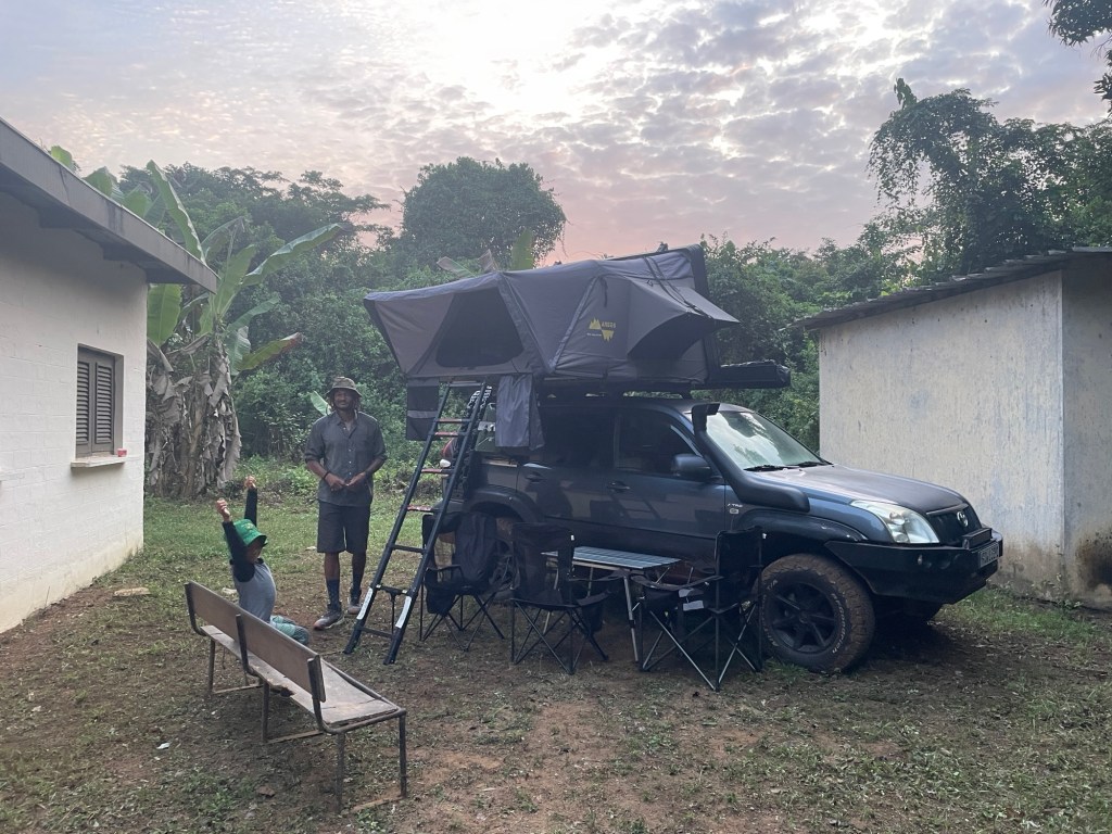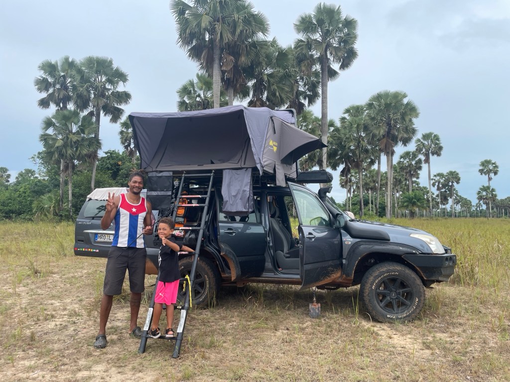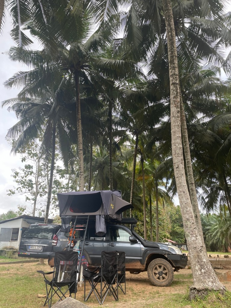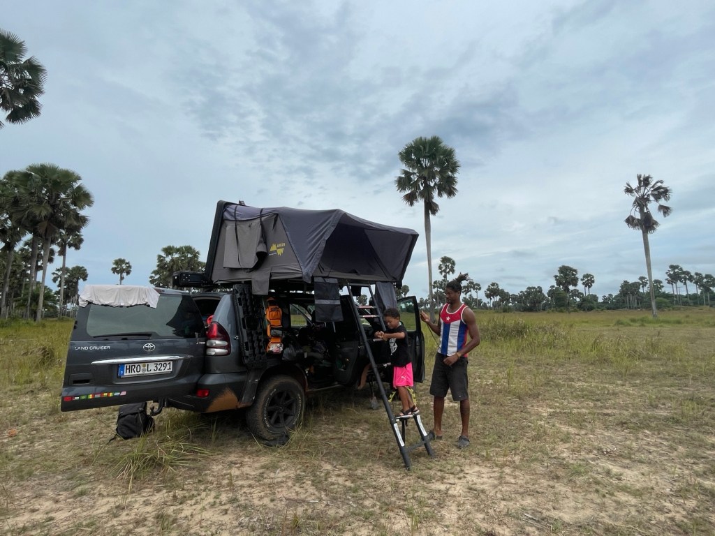 Nachdem wir unsere militärische Eskorte an ihrer Kaserne abgesetzt und zu Abend gegessen hatten, fuhren wir zu einem ruhigen, abgelegenen Feld, wo wir für die Nacht wild zelteten. Dies war unsere erste Nacht im Freien seit langem, und unglücklicherweise regnete es die ganze Nacht über sehr stark und ein Gewitter zog direkt über unsere Köpfe hinweg. Als wir am nächsten Morgen aufwachten, sahen wir ganz in unserer Nähe eine ausgebrannte Palme, die aussah, als wäre sie vom Blitz getroffen worden….. wir hatten Glück 😳.