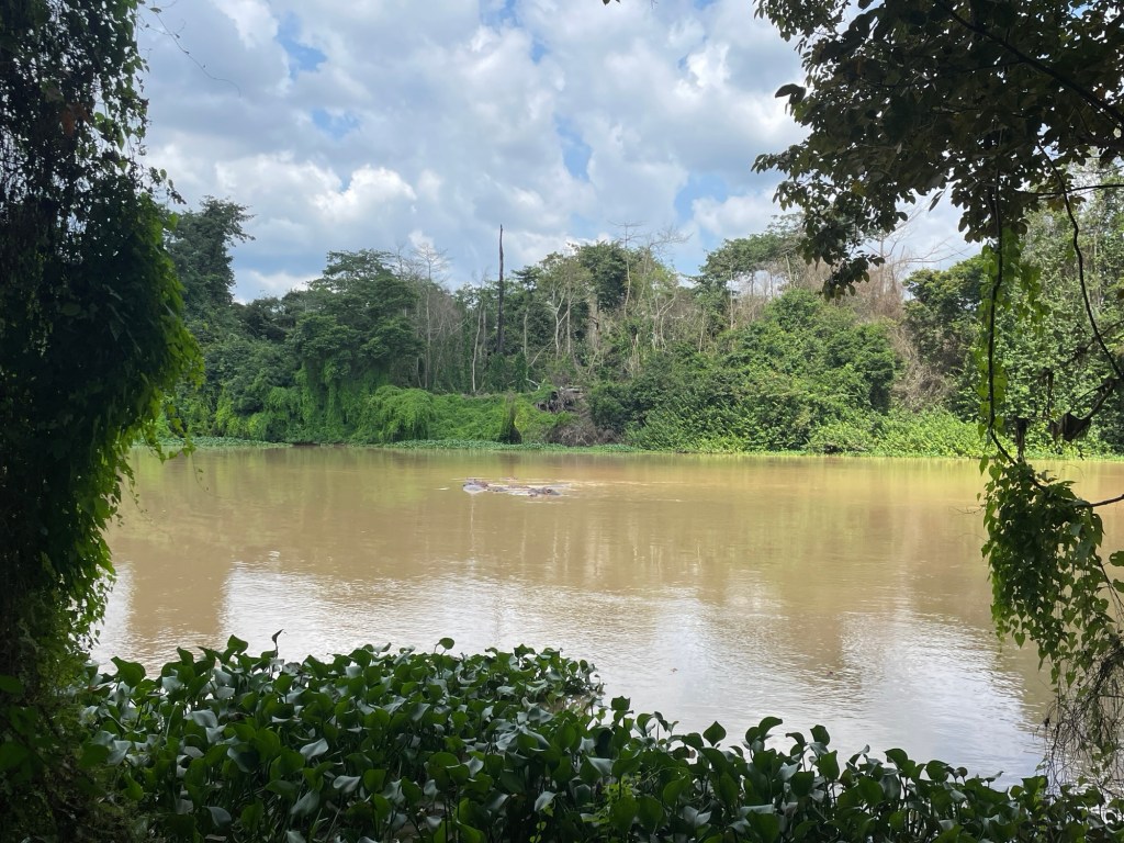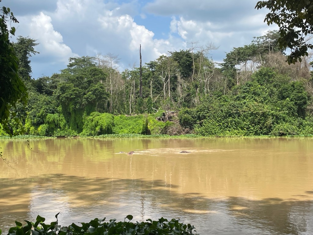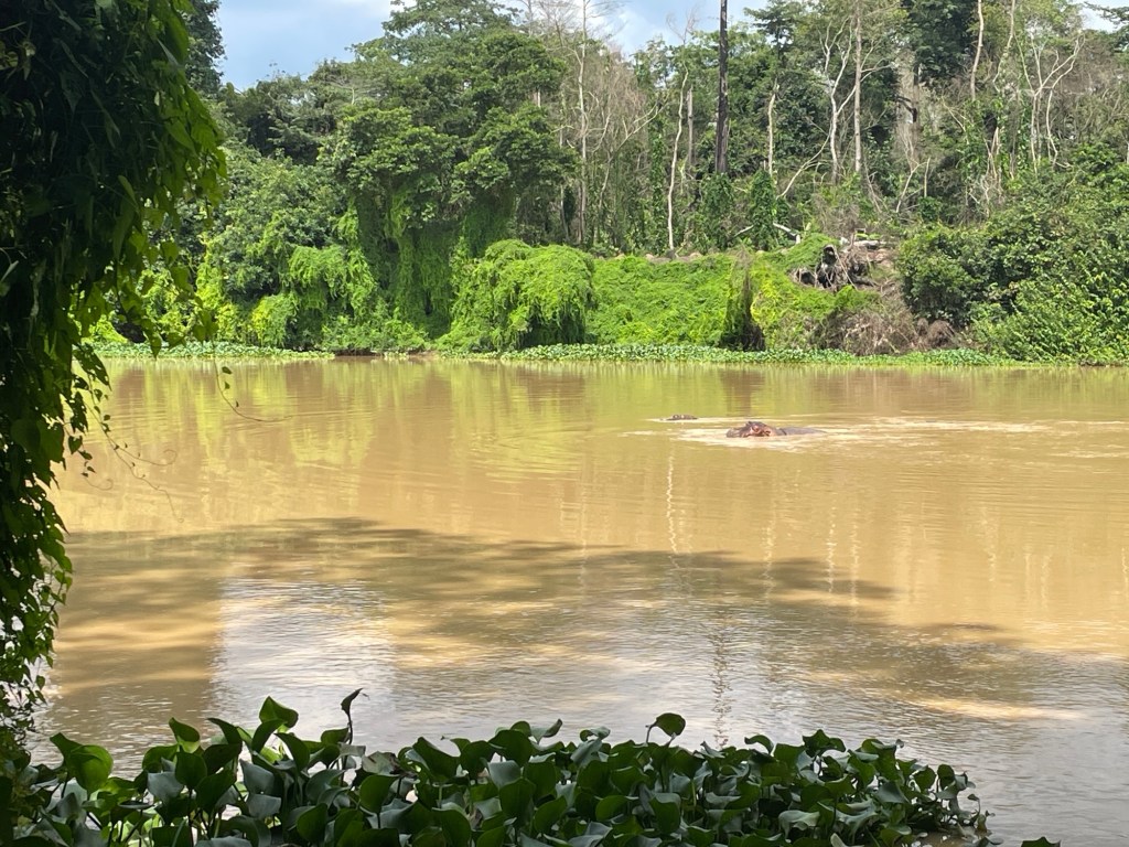 Nachdem wir erfahren hatten, dass wir einige Arbeitstage auf unsere Ghana-Visa warten mussten, beschlossen wir, die Zeit zu nutzen, um die Stadt zu verlassen und einige Sehenswürdigkeiten in der Nähe zu besuchen. Zuerst besuchten wir ein Gebiet, in dem wir Flusspferde in freier Wildbahn sehen konnten! Wir waren sehr aufgeregt, und selbst als wir im Schlamm stecken blieben und das Auto mit bloßen Händen ausgraben mussten, konnte das die Stimmung nicht trüben! Wir setzten uns in aller Ruhe an ein Flussufer und beobachteten eine große Gruppe von Nilpferden, die im Wasser chillten – es war unglaublich!