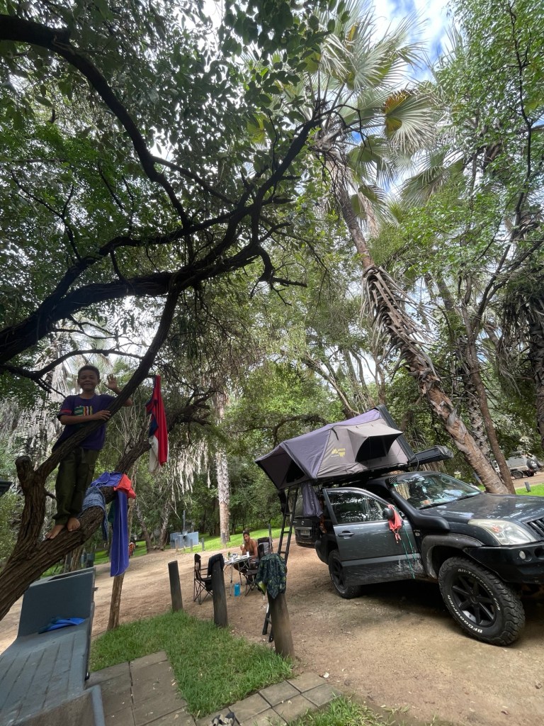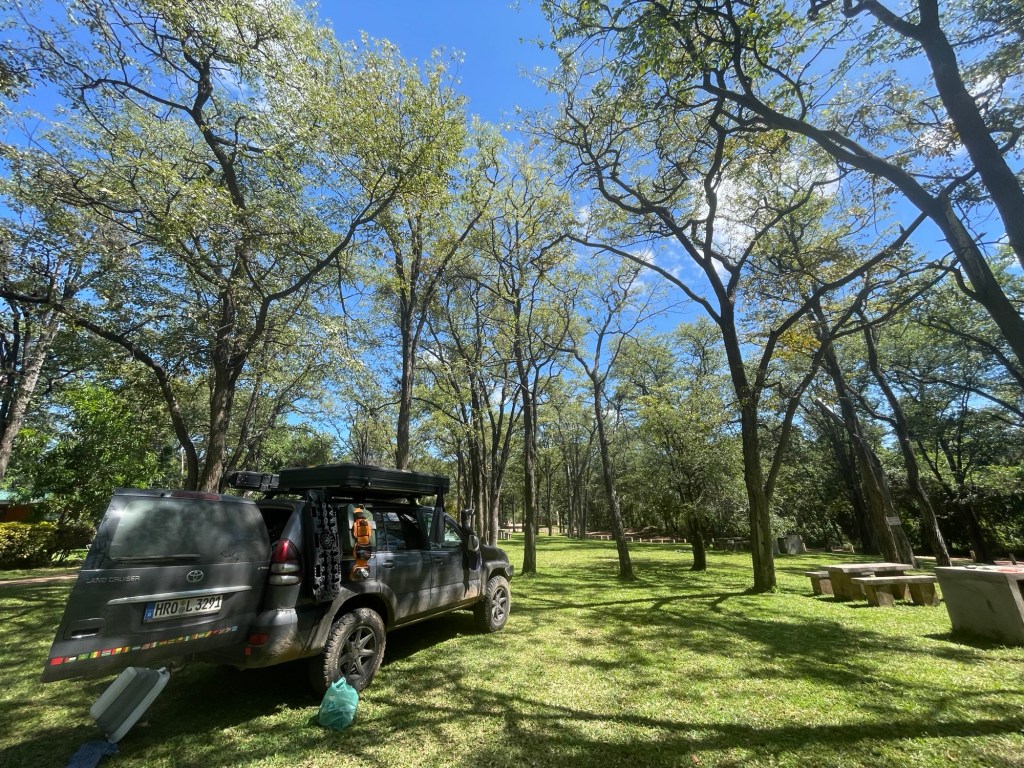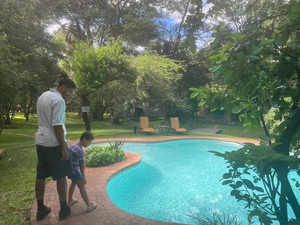 Am nächsten Morgen standen wir in aller Herrgottsfrühe auf, um dieses Elendsviertel hinter uns zu lassen, und beschlossen, unsere Route zu ändern, damit wir auf etwas besseren, wenn auch längeren Straßen fahren konnten. Wir machten uns auf den Weg nach Kariba, der Stadt am Ufer des Kariba-Sees, dem volumenmäßig größten künstlichen See der Welt, der zugleich ein Stausee für Wasserkraft ist. Der Campingplatz, den wir fanden, war ein absolutes Juwel, mit dem meiner Meinung nach besten Pool, den wir bisher nutzen durften (und das waren schon einige). Ein weiteres großartiges Highlight war der nächtliche Besuch von zwei RIESIGEN Flusspferden, die auf dem Campingplatz grasten. Sie schienen sich nicht an den Campern zu stören und schlenderten grasend umher, während wir den Abend am Auto saßen.