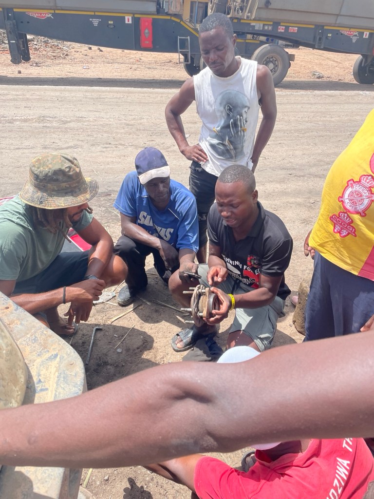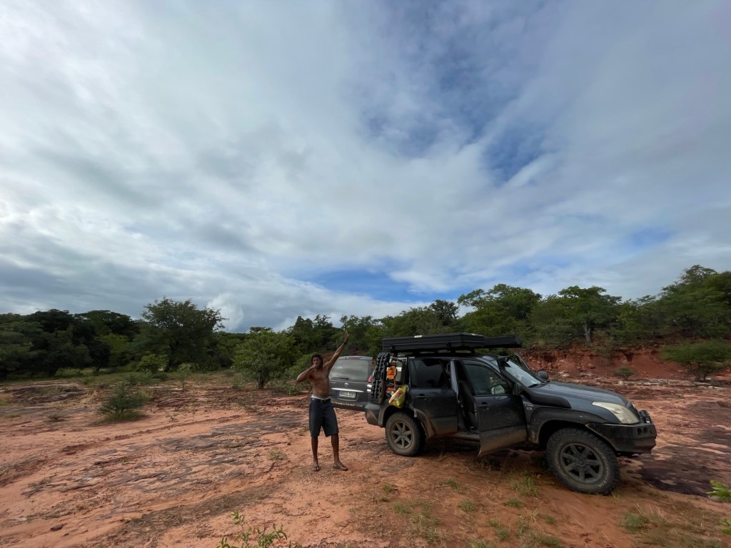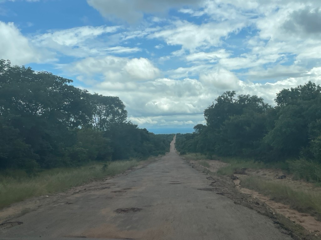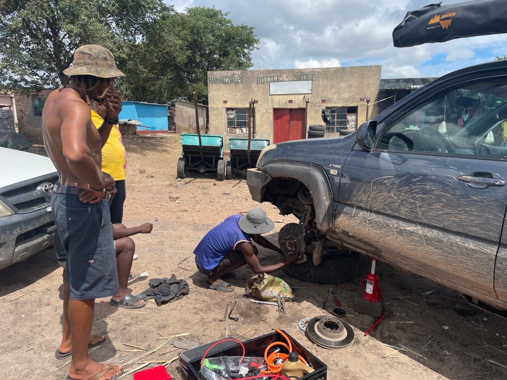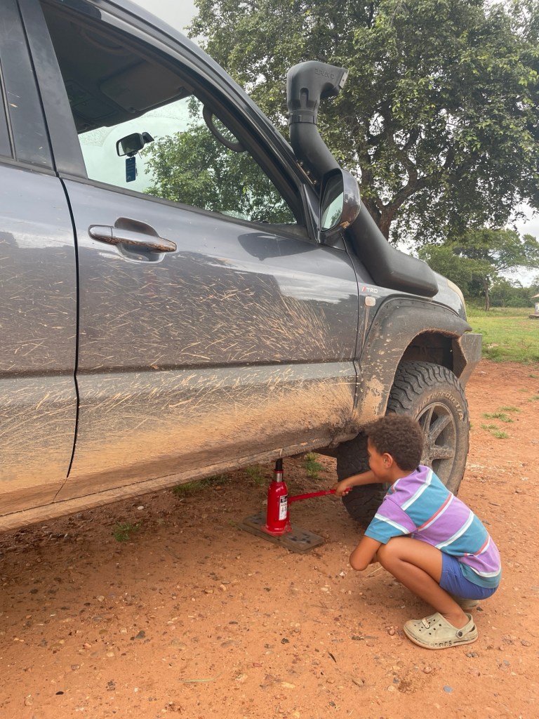 Am Ende des zweiten Tages mussten wir den Park verlassen und kehrten zu dem neuen Campingplatz zurück, der uns vor unserem Besuch im Park so gut gefallen hatte. Dort genossen wir ein leckeres Essen und entspannten uns in dem schönen Infinity-Pool. Am nächsten Tag wollten wir zum nächsten Nationalpark auf unserer Liste, Mana Pools, fahren, doch wir merkten schnell, dass es eine anstrengende Fahrt werden würde, da die Straße in einem furchtbaren Zustand war. Voller Schlaglöcher und kaputten Asphalt kamen wir kaum voran. Wir mussten die Nacht wild campen und bemerkten am nächsten Morgen sofort, dass etwas mit den Vorderreifen nicht stimmte. Wir rollten langsam zum nächsten Dorf, um das Auto aufzubocken und die Unterseite zu inspizieren: Es war ganz klar, dass beide vorderen Lager kaputt waren. Auch in der nächstgrößeren Stadt gab es die benötigten Ersatzteile nicht, also lieh sich Marian von jemandem aus dem Dorf ein Motorrad und fuhr die zwei Stunden zur nächstgrößeren Stadt, wo die Teile vorrätig waren. Solomon und ich blieben beim Auto und verbrachten die Zeit mit den Einheimischen und den Kindern, bis Marian zurückkam.
