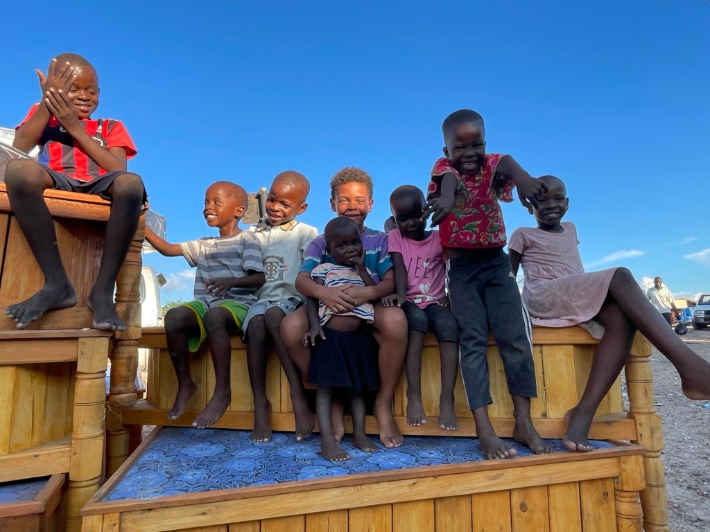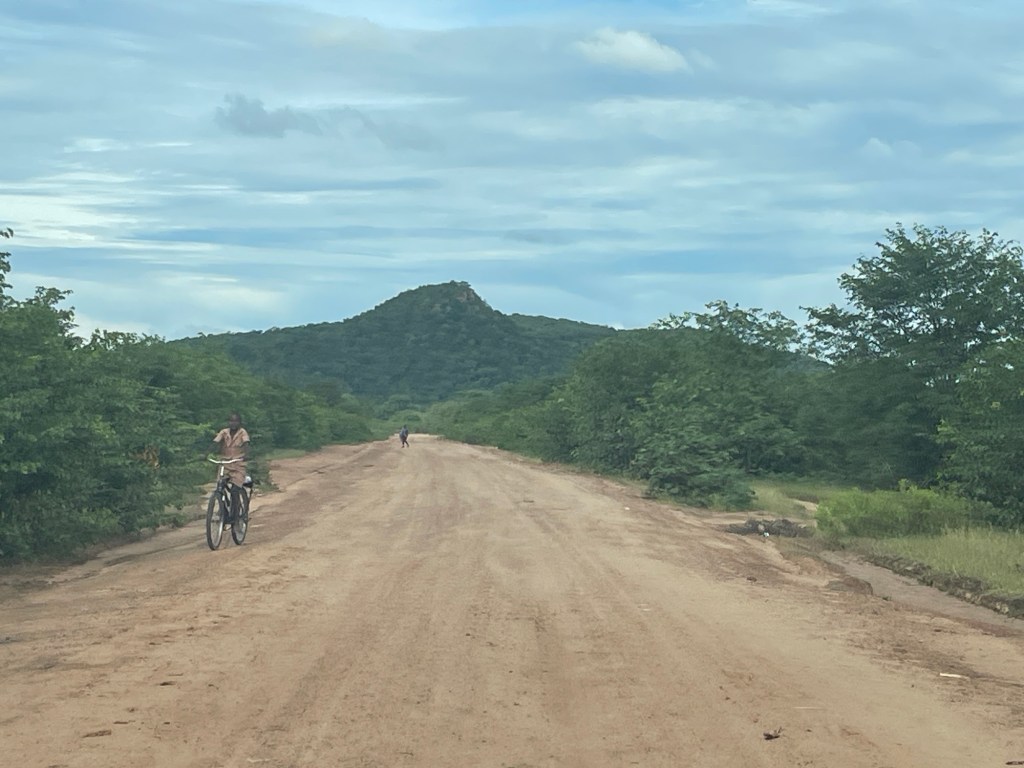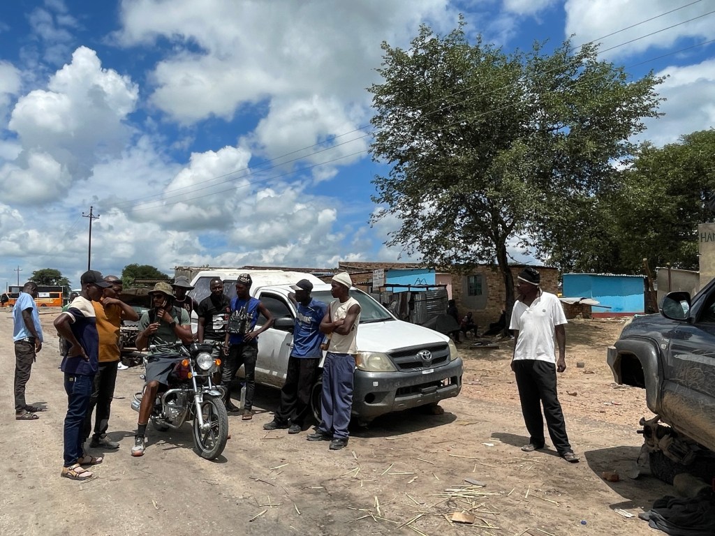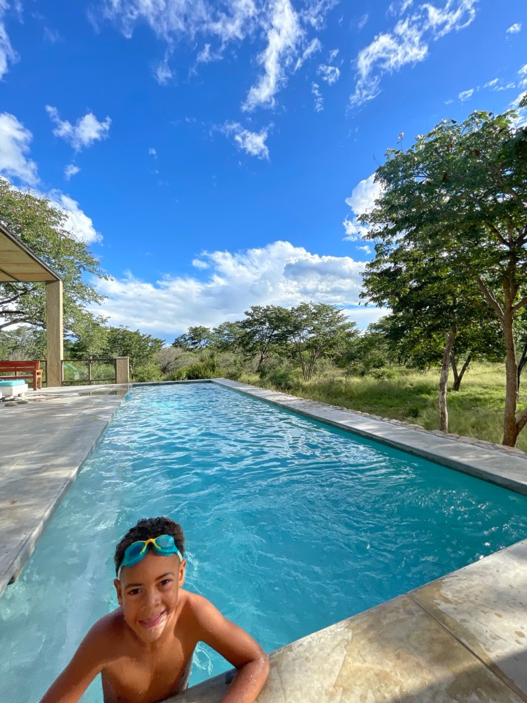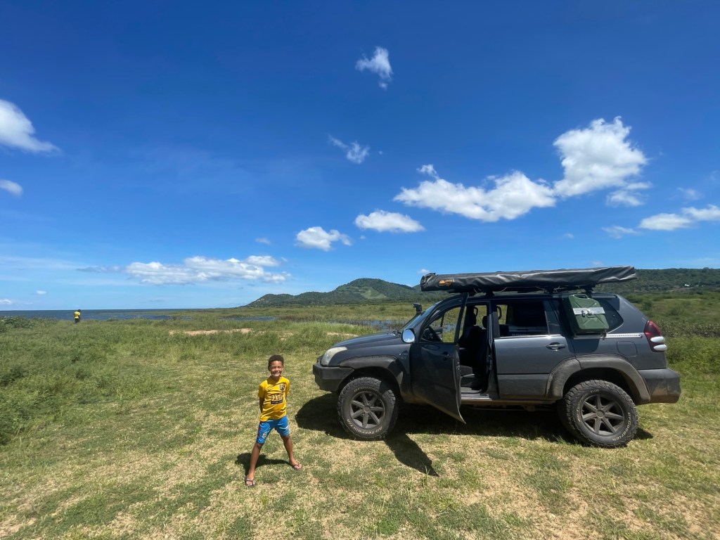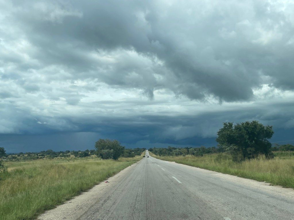 Am Ende des zweiten Tages mussten wir den Park verlassen und kehrten zu dem neuen Campingplatz zurück, der uns vor unserem Besuch im Park so gut gefallen hatte. Dort genossen wir ein leckeres Essen und entspannten uns in dem schönen Infinity-Pool. Am nächsten Tag wollten wir zum nächsten Nationalpark auf unserer Liste, Mana Pools, fahren, doch wir merkten schnell, dass es eine anstrengende Fahrt werden würde, da die Straße in einem furchtbaren Zustand war. Voller Schlaglöcher und kaputten Asphalt kamen wir kaum voran. Wir mussten die Nacht wild campen und bemerkten am nächsten Morgen sofort, dass etwas mit den Vorderreifen nicht stimmte. Wir rollten langsam zum nächsten Dorf, um das Auto aufzubocken und die Unterseite zu inspizieren: Es war ganz klar, dass beide vorderen Lager kaputt waren. Auch in der nächstgrößeren Stadt gab es die benötigten Ersatzteile nicht, also lieh sich Marian von jemandem aus dem Dorf ein Motorrad und fuhr die zwei Stunden zur nächstgrößeren Stadt, wo die Teile vorrätig waren. Solomon und ich blieben beim Auto und verbrachten die Zeit mit den Einheimischen und den Kindern, bis Marian zurückkam.