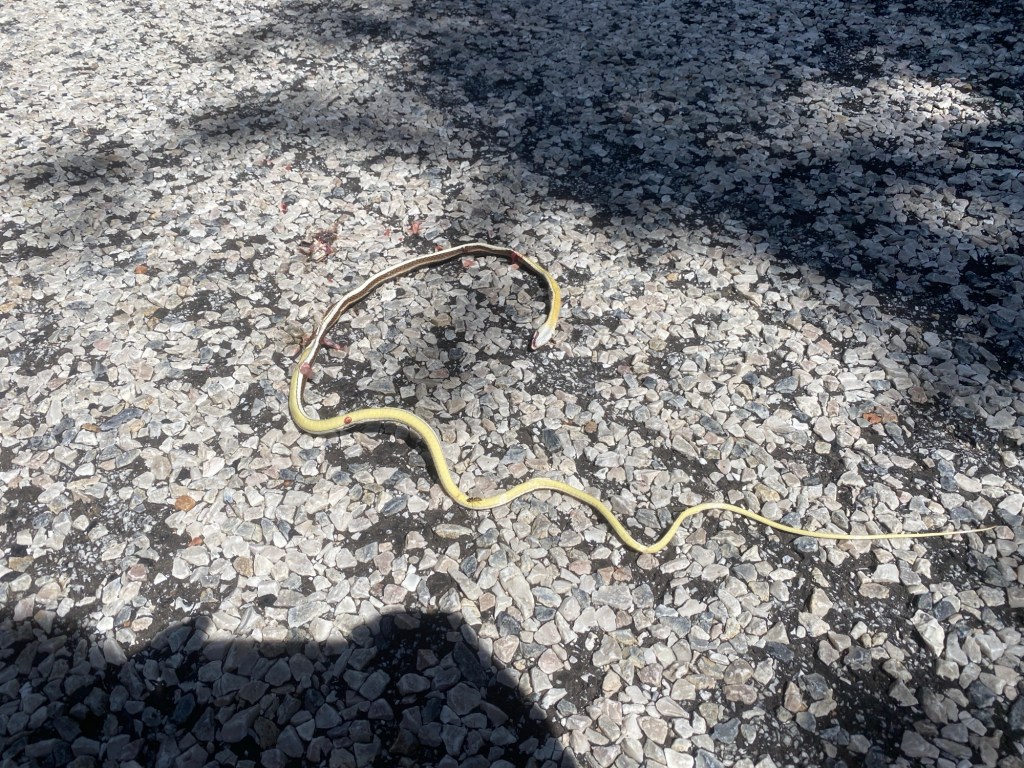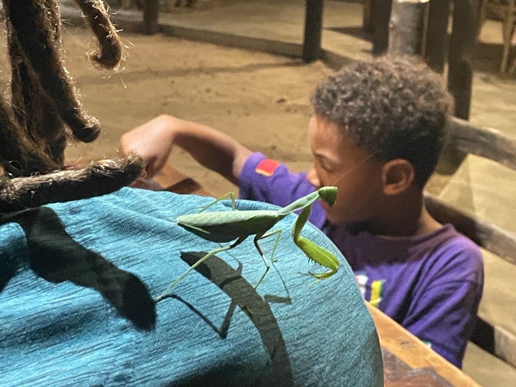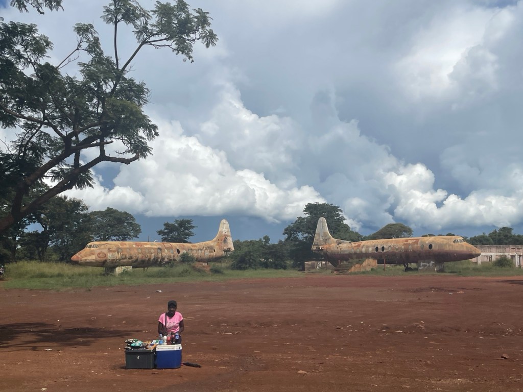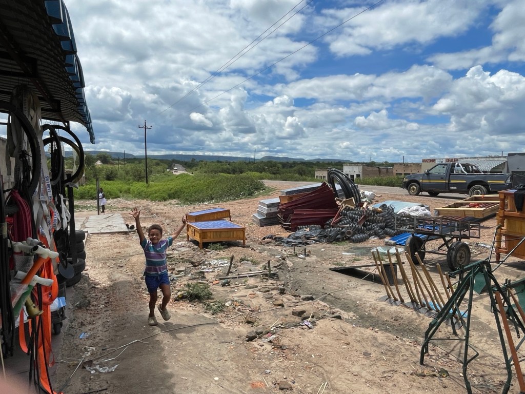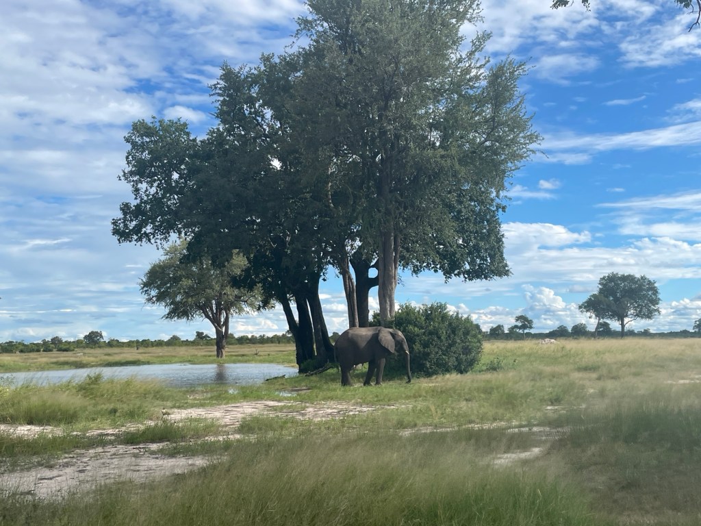 Am Ende des zweiten Tages mussten wir den Park verlassen und kehrten zu dem neuen Campingplatz zurück, der uns vor unserem Besuch im Park so gut gefallen hatte. Dort genossen wir ein leckeres Essen und entspannten uns in dem schönen Infinity-Pool. Am nächsten Tag wollten wir zum nächsten Nationalpark auf unserer Liste, Mana Pools, fahren, doch wir merkten schnell, dass es eine anstrengende Fahrt werden würde, da die Straße in einem furchtbaren Zustand war. Voller Schlaglöcher und kaputten Asphalt kamen wir kaum voran. Wir mussten die Nacht wild campen und bemerkten am nächsten Morgen sofort, dass etwas mit den Vorderreifen nicht stimmte. Wir rollten langsam zum nächsten Dorf, um das Auto aufzubocken und die Unterseite zu inspizieren: Es war ganz klar, dass beide vorderen Lager kaputt waren. Auch in der nächstgrößeren Stadt gab es die benötigten Ersatzteile nicht, also lieh sich Marian von jemandem aus dem Dorf ein Motorrad und fuhr die zwei Stunden zur nächstgrößeren Stadt, wo die Teile vorrätig waren. Solomon und ich blieben beim Auto und verbrachten die Zeit mit den Einheimischen und den Kindern, bis Marian zurückkam.