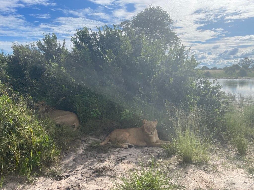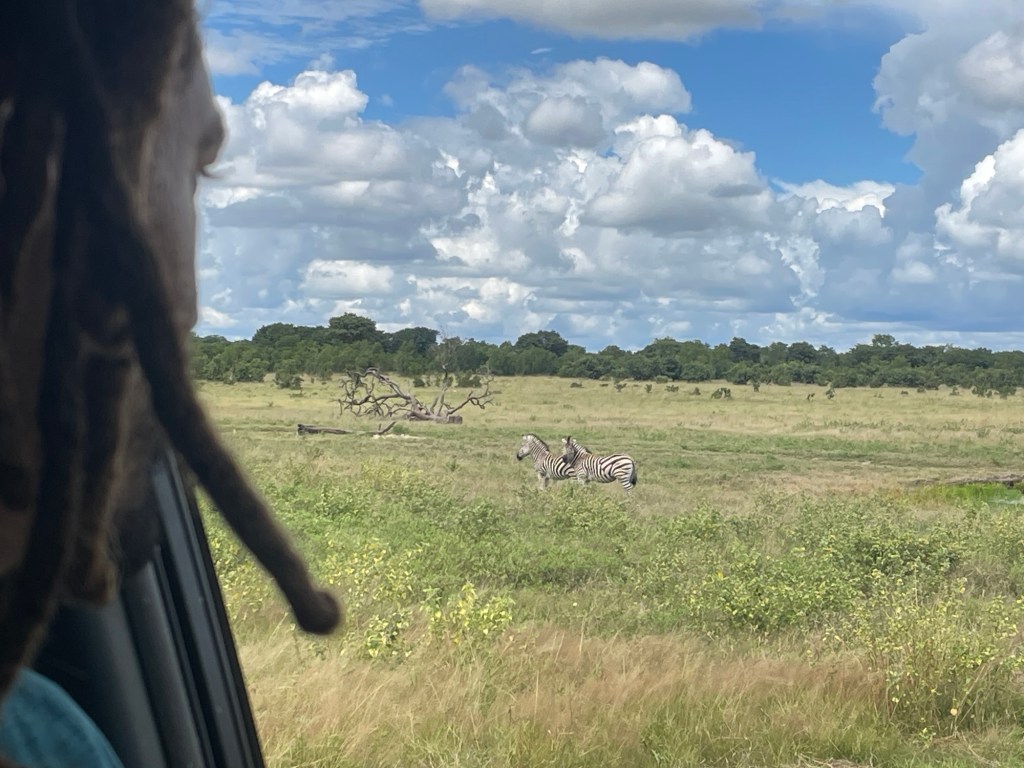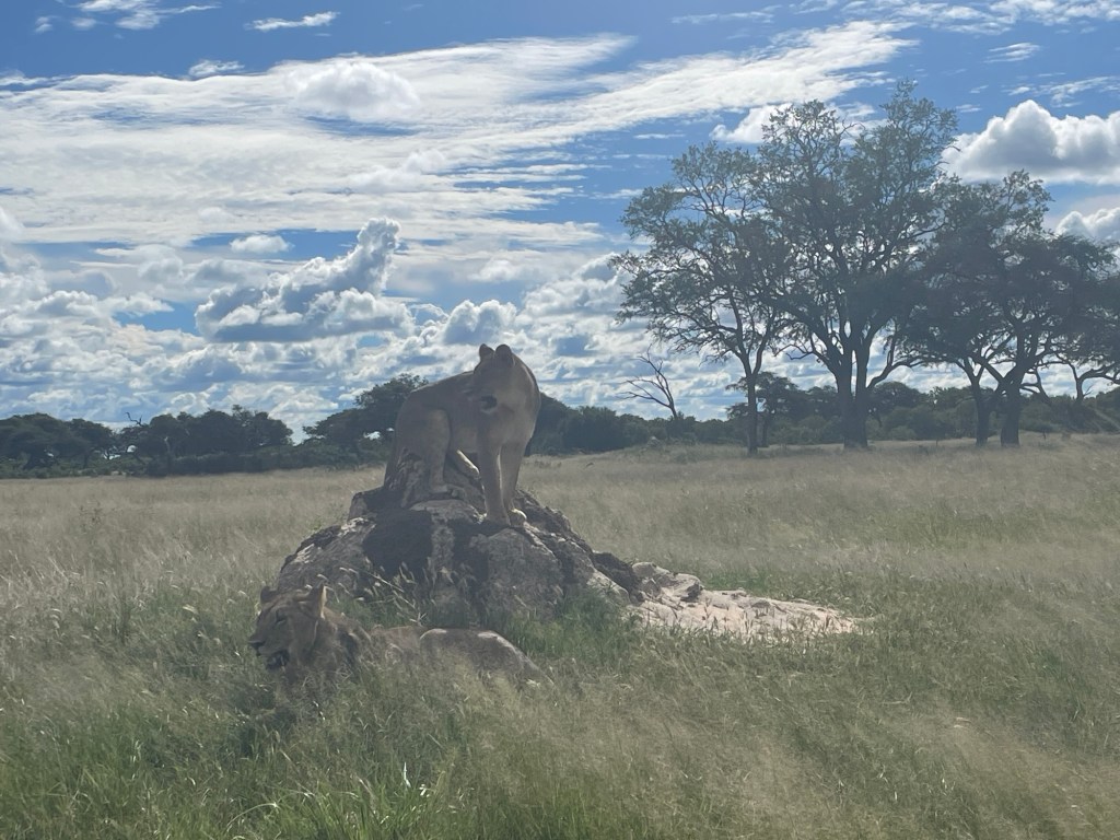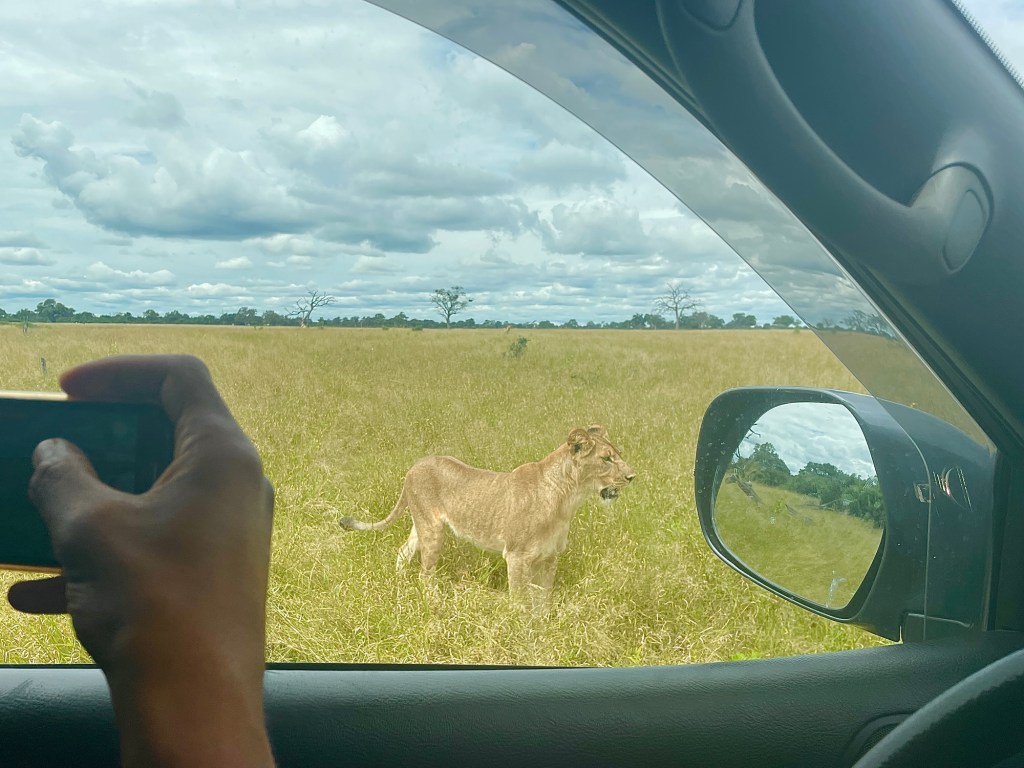 Am nächsten Morgen nach dem Frühstück machten wir uns auf den Weg zurück nach Hwange, zahlten unseren Eintritt und fuhren hinein. Wir hielten Ausschau nach Löwen und wurden NICHT enttäuscht! Nachdem wir eine Weile gefahren waren, sahen wir ein anderes Safarifahrzeug, das dort stand und eine Bewegung im Gras beobachtete. Wir beschlossen, uns zu ihnen zu gesellen und nachzusehen, was es mit dem ganzen Trubel auf sich hatte. Wir waren auf zwei wunderschöne Löwinnen gestoßen, die über die Savanne stolzierten! Wir hielten an, um sie eine Weile zu beobachten, und waren begeistert (und ein wenig erschrocken), als sie direkt neben und vor unserem Auto vorbeischlenderten! Es war buchstäblich atemberaubend. Wir fuhren den ganzen Tag durch den Park und übernachteten sogar im Park selbst. Der sehr niedrige Zaun um unseren Campingplatz ließ zwar zu wünschen übrig, aber wir schliefen dort wunderbar und hörten am nächsten Morgen früh auch einen großen Löwen brüllen. Der Mitarbeiter des Camps bot uns an, uns zu zeigen, wo sich der Löwe aufhielt, und wir konnten aus unserem Auto heraus ganz aus der Nähe beobachten, wie er sich mit einem Weibchen paarte.