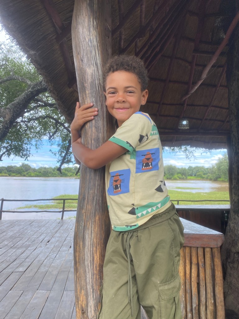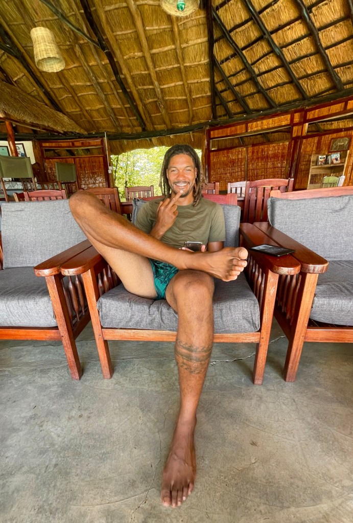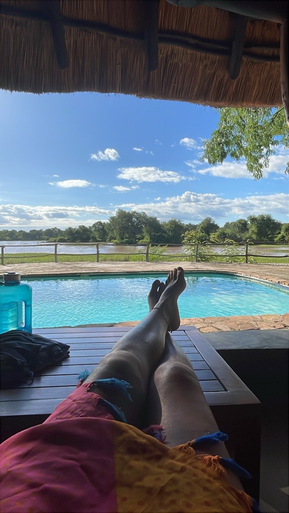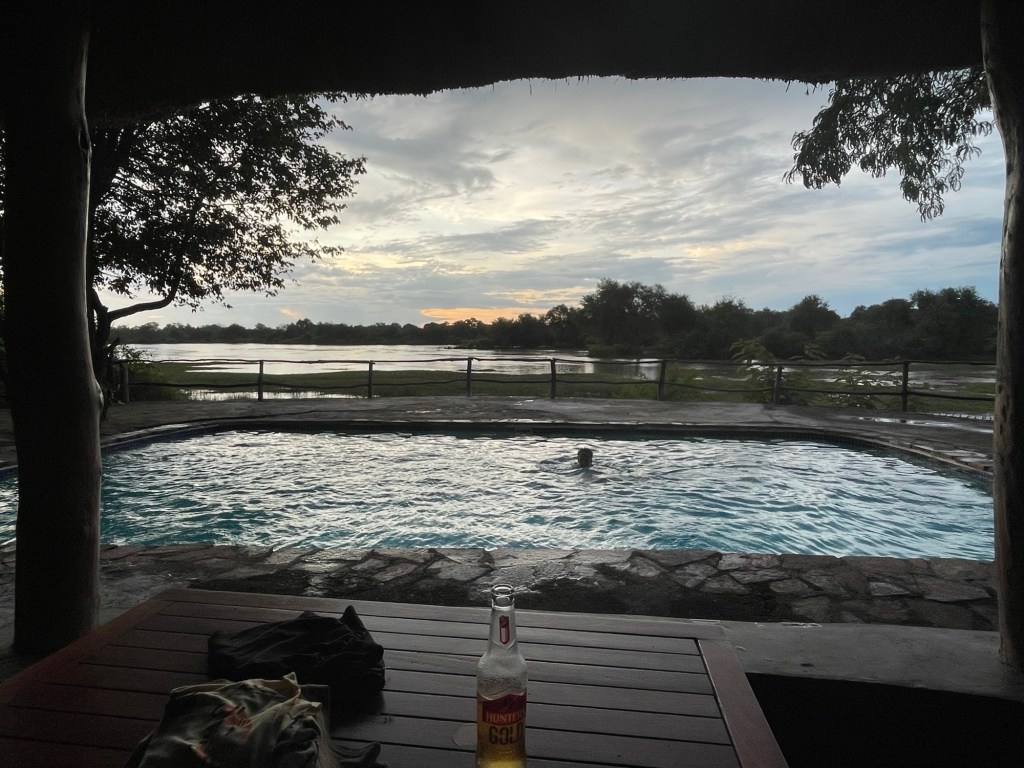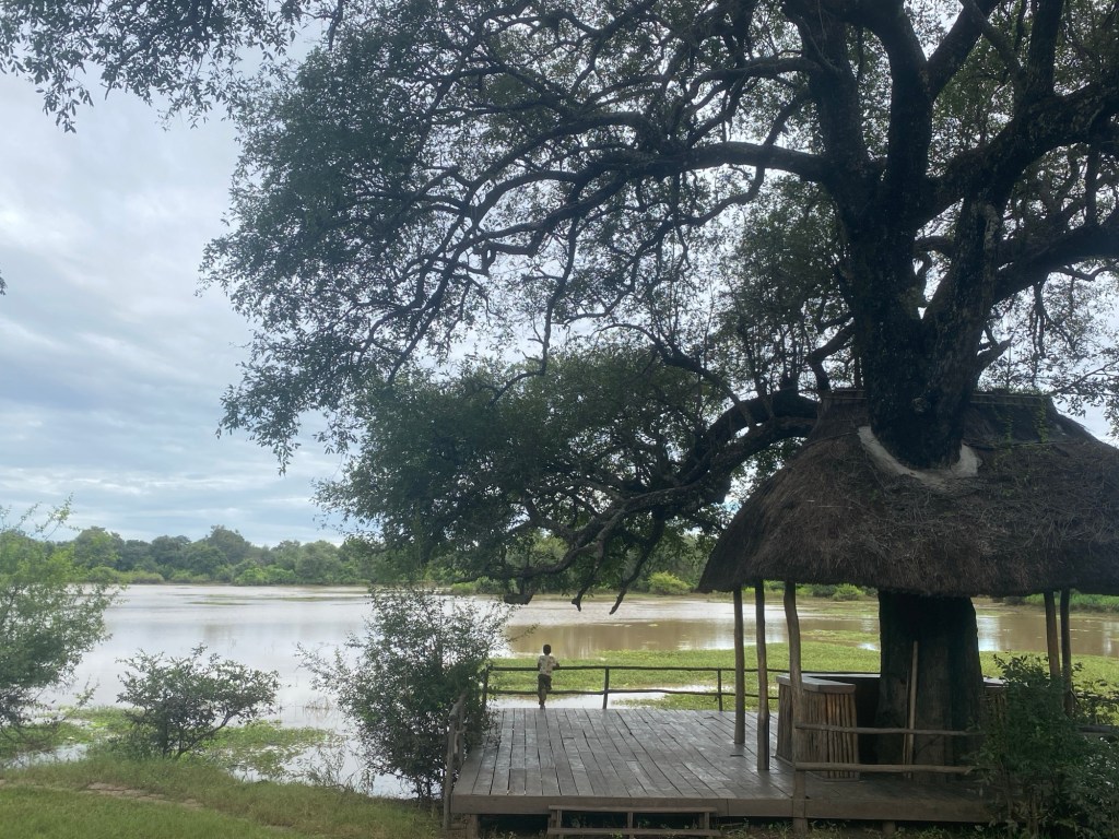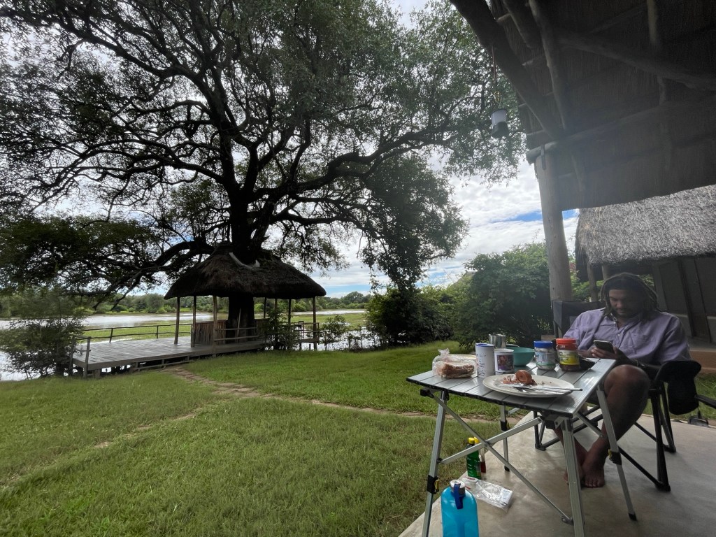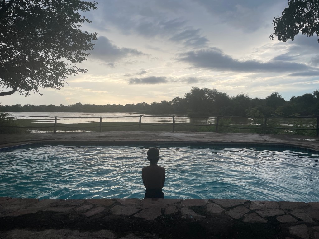 Wir hatten bereits online einen Campingplatz und eine Lodge in der Nähe des Eingangs zum Nationalpark entdeckt und waren angenehm überrascht, als wir dort ankamen. Obwohl der Campingplatz gerade renoviert wurde, suchte das freundliche Personal einen schönen Platz zum Zelten für uns aus, und wir konnten den herrlichen Pool, die Bar und die Terrasse mit Blick auf eine Lagune des Luangwe-Flusses nutzen. Hier planschten und brüllten ständig Flusspferde herum, und wir sahen auch einige riesige Krokodile vorbeischwimmen – es war ein wunderbarer Ort zum Campen!